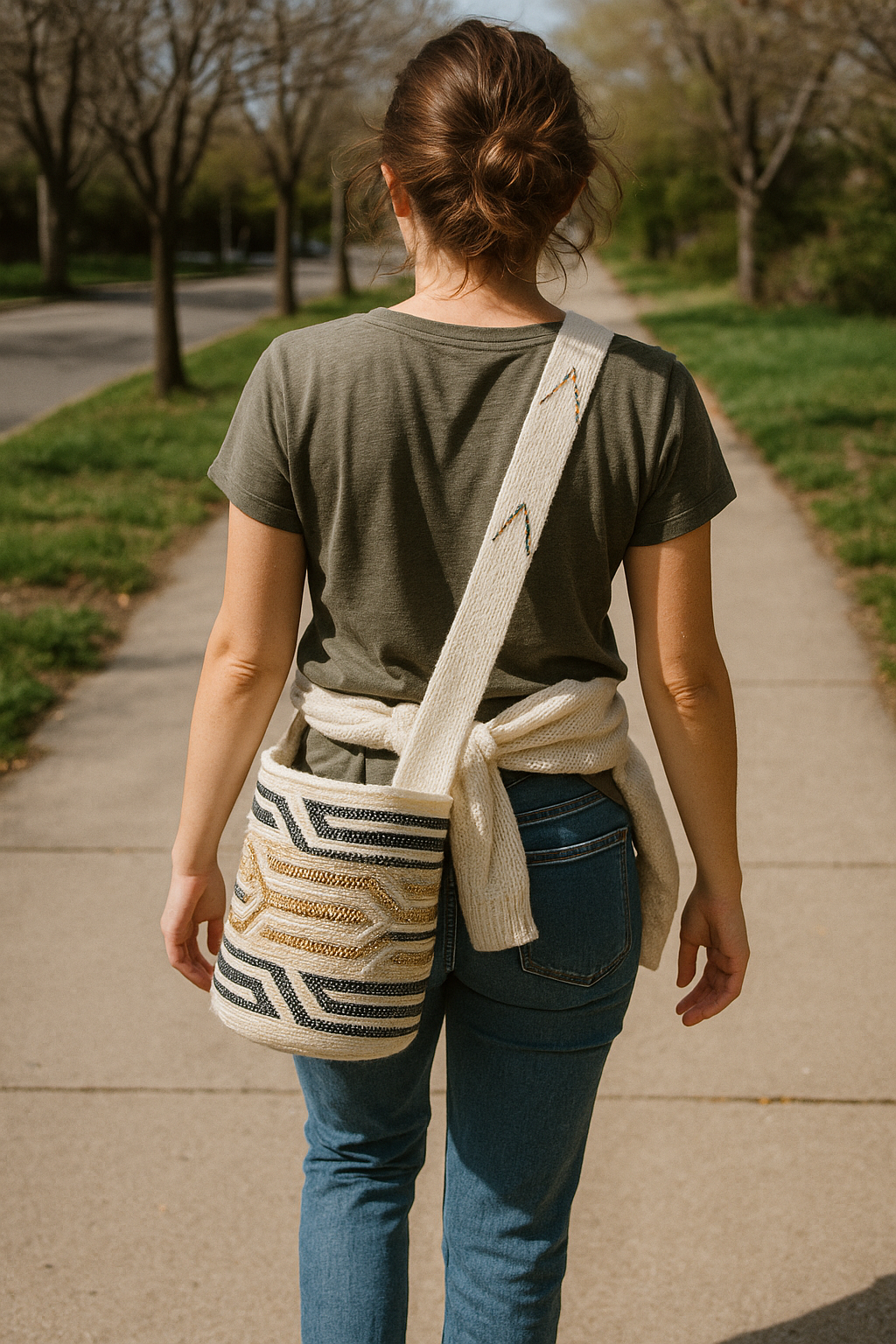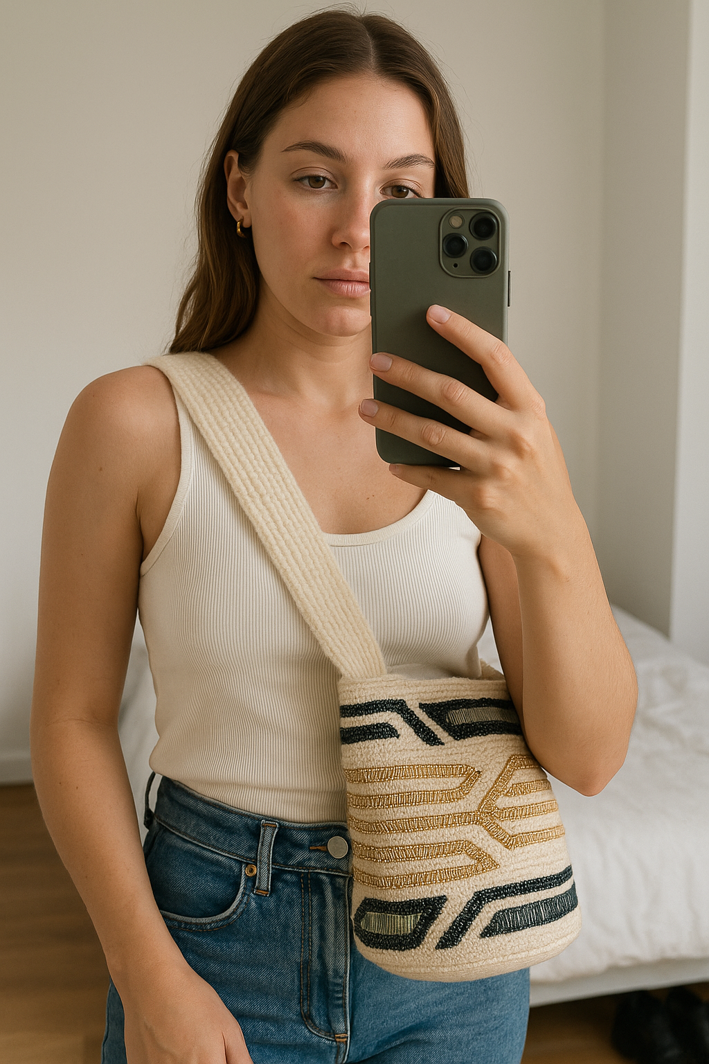 Tejida en las montañas de Pueblo Bello, Colombia, MAÍA es un homenaje silencioso al resplandor. Con una base crema tocada por tonos blanco plateado, dorado y carbón, esta pieza refleja la luz desde cada ángulo. Su complejidad tonal susurra elegancia — no es estridente, pero sí inolvidable.