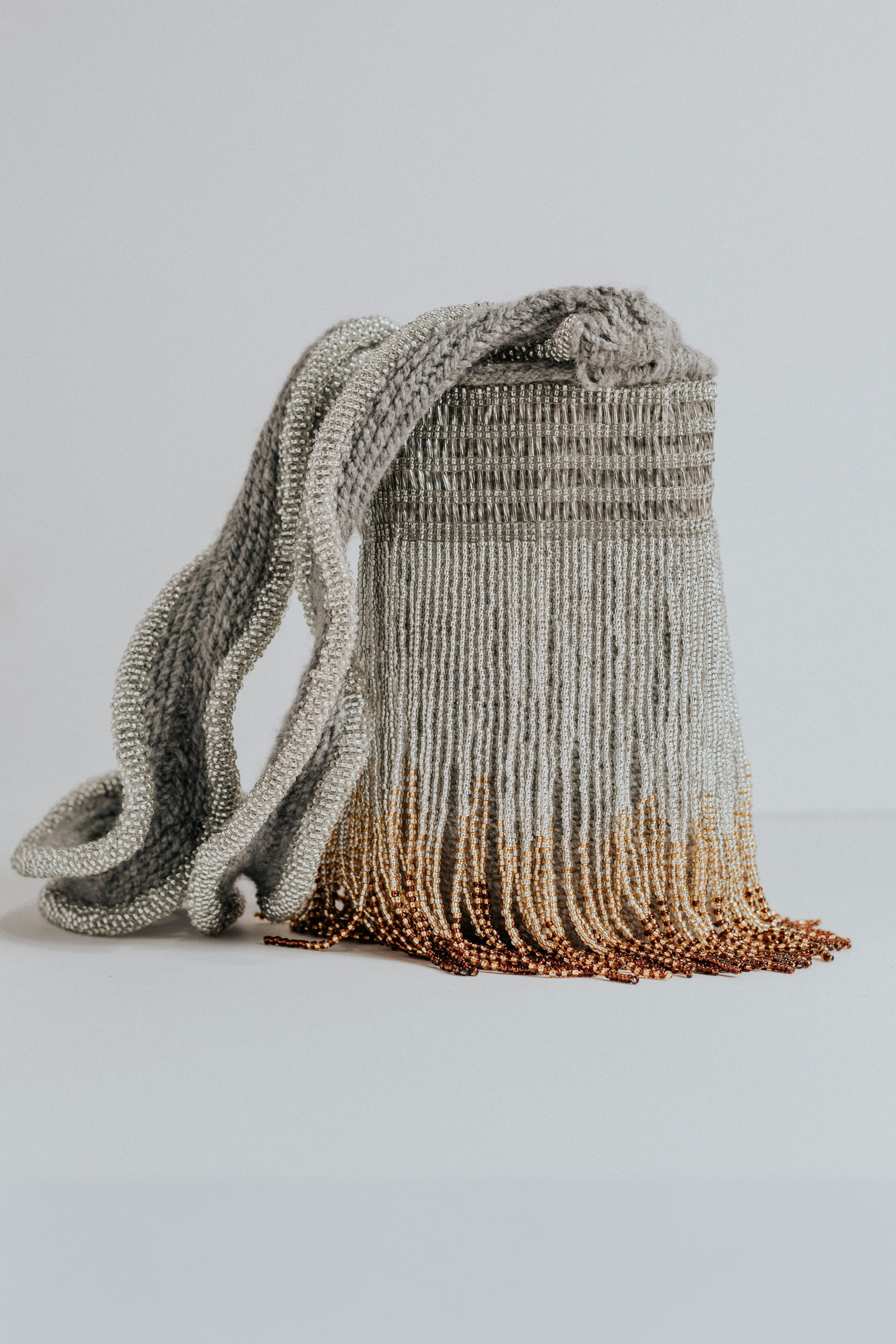 Tejida a mano en Pueblo Bello, Colombia, PÁRAMO está inspirada en los paisajes serenos de los páramos andinos. Su cuerpo en gris suave fluye hacia un fleco en cascada que se intensifica en tonos cobrizos — evocando el degradé natural entre la tierra y el cielo. Terminada con un strap texturizado, esta pieza es tan sólida como elegante.