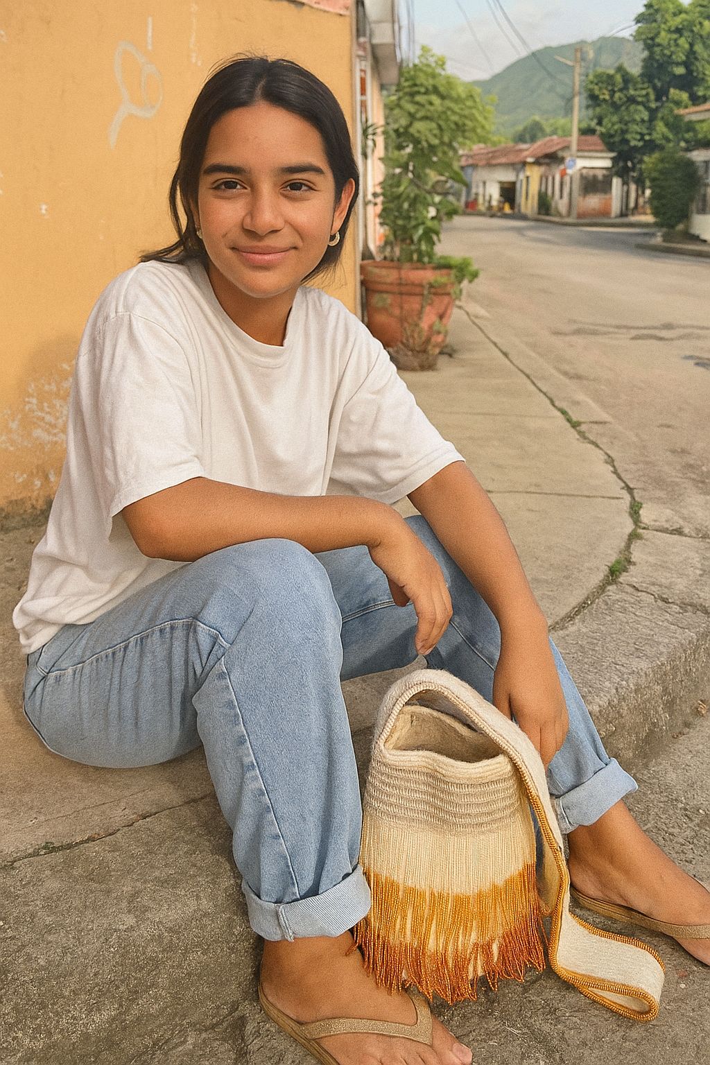 Cuidadosamente tejida a mano en Pueblo Bello, Colombia, IRUA celebra el equilibrio a través del tono y la textura. Su base en marfil refinado fluye hacia bordados en ámbar cálido y ocre, evocando una luz enraizada. Un suave degradé y una silueta minimalista hacen de esta pieza algo atemporal y a la vez impactante.