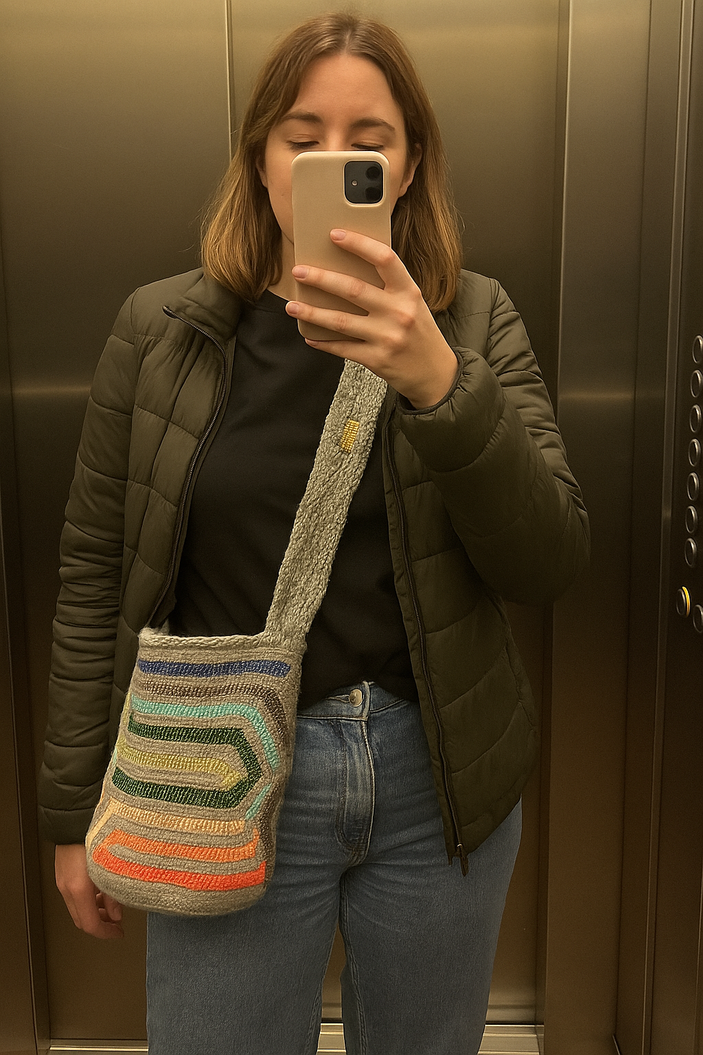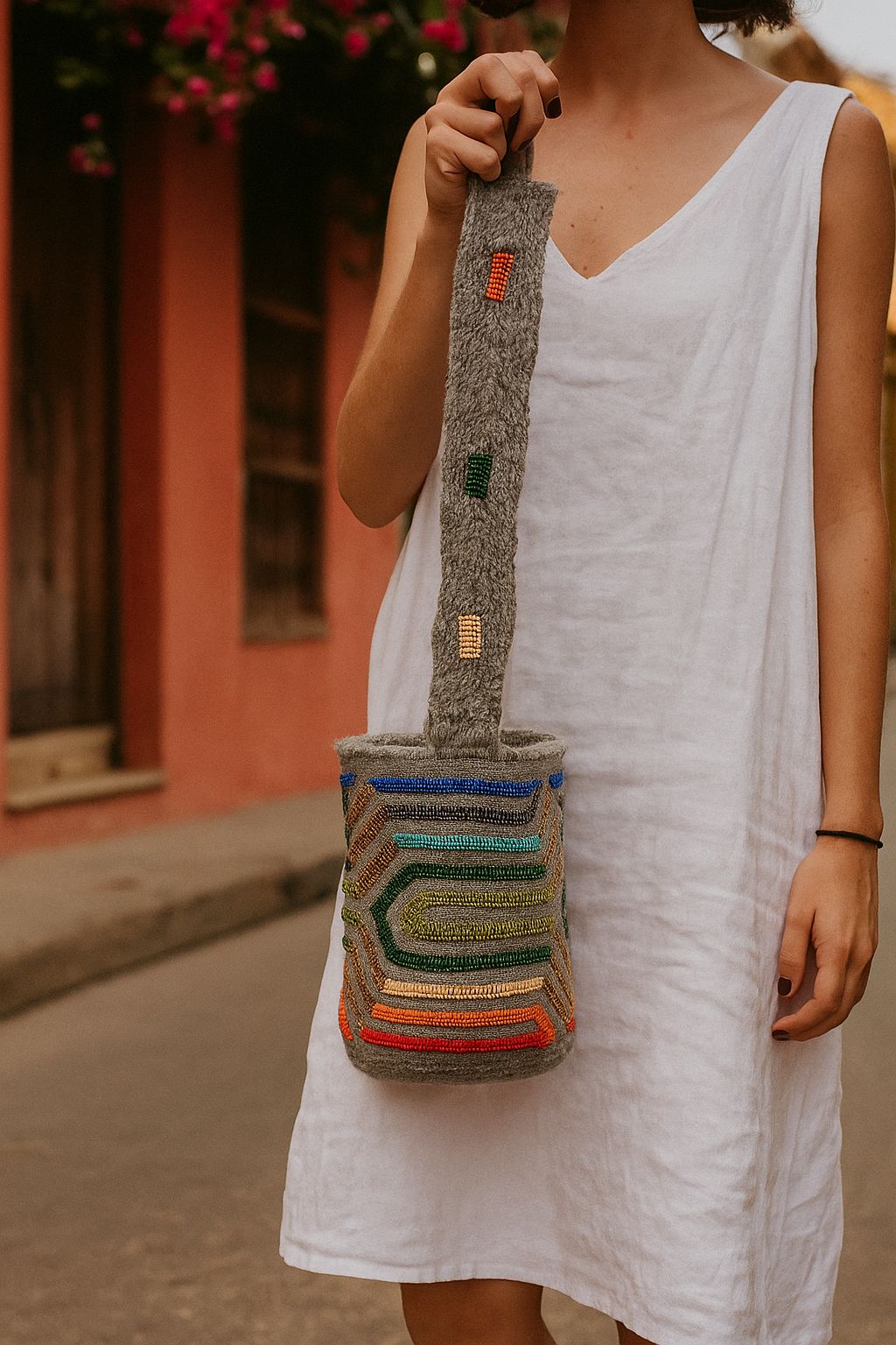 Tejida a mano en Pueblo Bello, Colombia, SAVIA está inspirada en la energía vibrante que recorre las venas de la naturaleza. Sobre una base gris terrosa, su bordado en chaquiras multicolor fluye como savia — desde verdes bosque y azules cielo hasta rojos intensos y ocres cálidos. Cada detalle, del cuerpo al strap, honra el movimiento, la vitalidad y la fuerza enraizada.