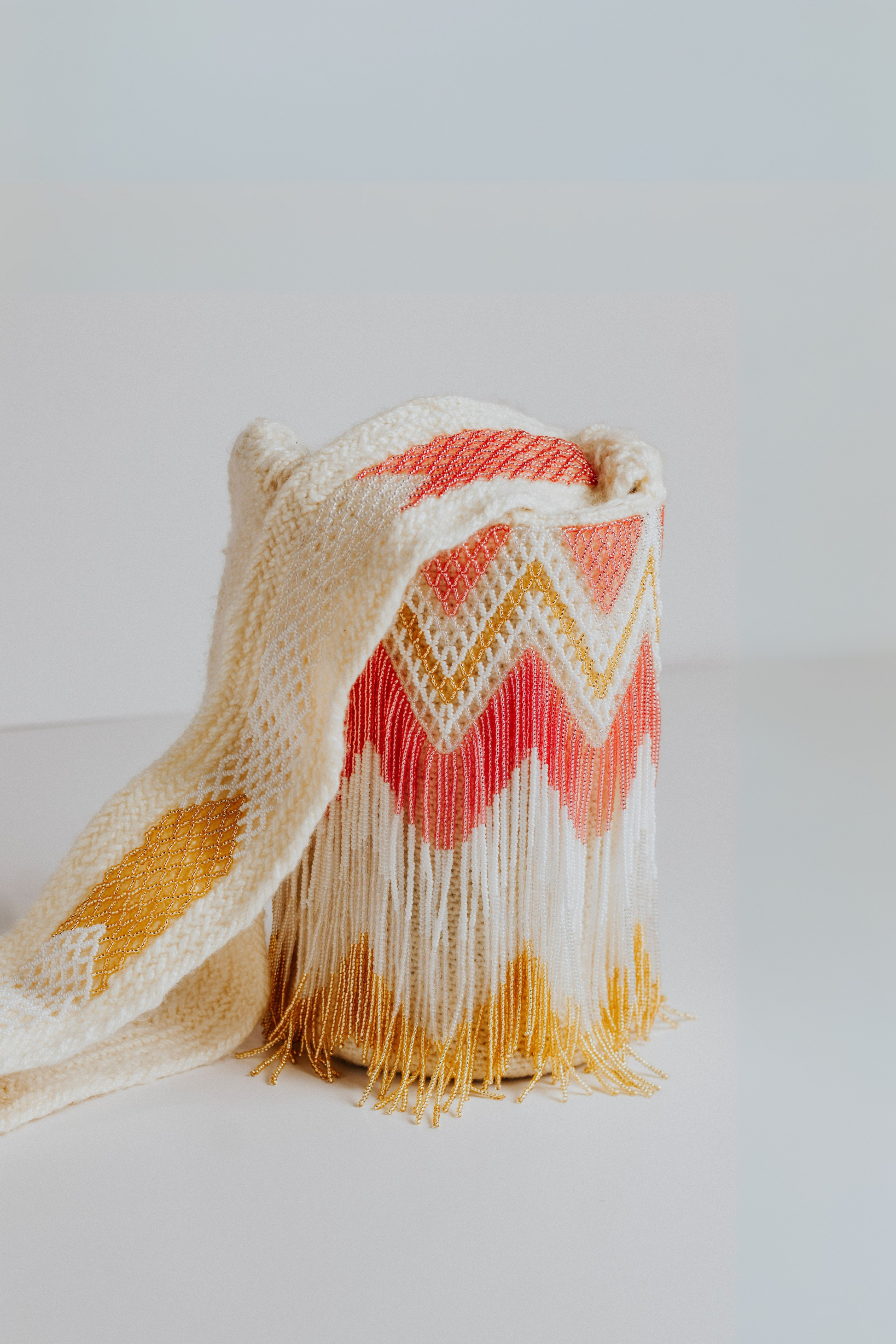 Tejida a mano en Pueblo Bello, Colombia, AURA fusiona el arte ancestral con un diseño elevado. Su cálida base en marfil cobra vida a través de un intrincado bordado en coral, dorado y perla suave — capturando el resplandor de la luz en movimiento.