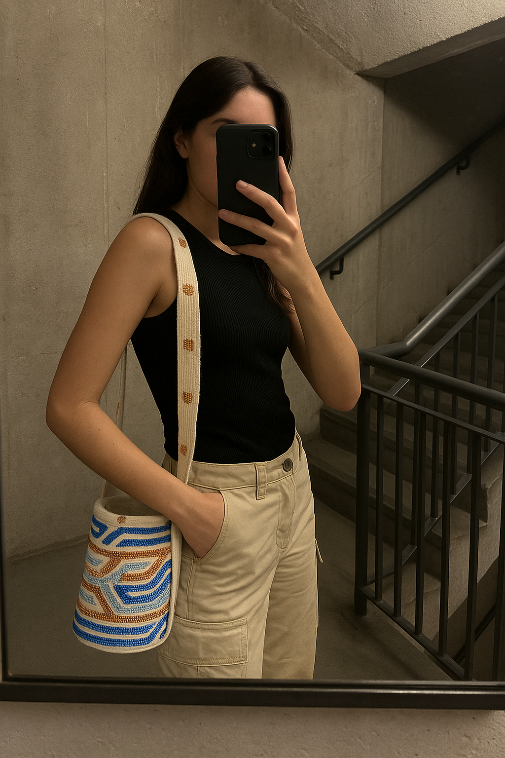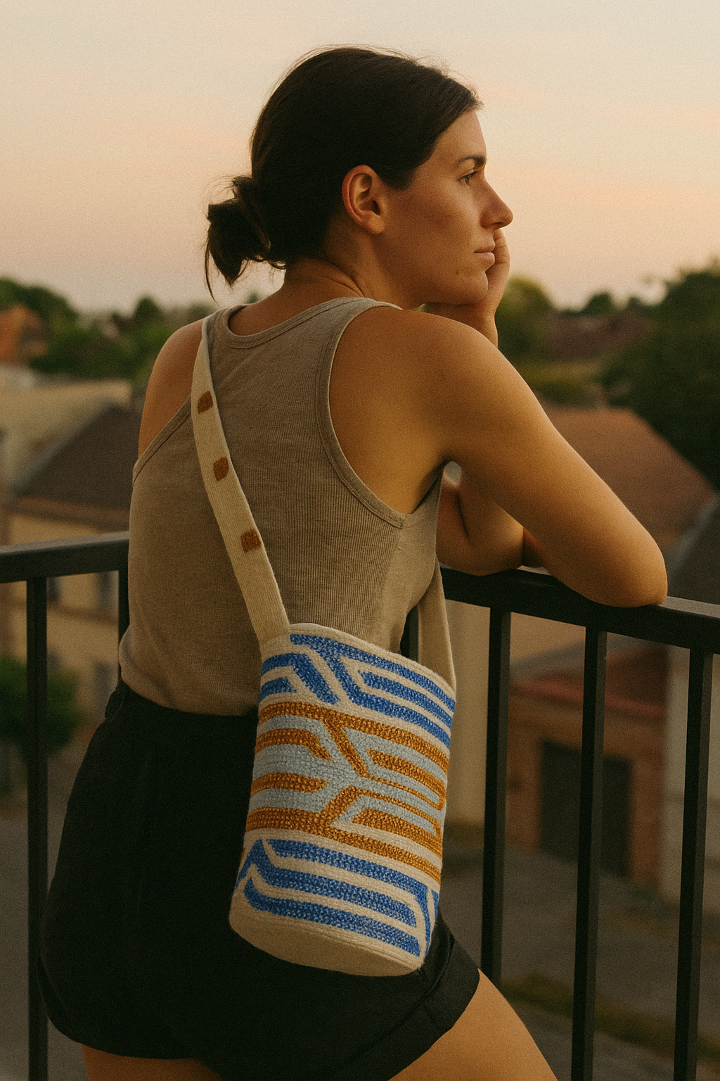 Tejida a mano en Pueblo Bello, Colombia, ALUNA fluye con ritmo y dualidad. Su diseño geométrico alterna azules vibrantes —cobalto y cielo— con bordados dorados intensos, simbolizando agua y energía, profundidad y claridad. La base marfil y el strap punteado mantienen la pieza anclada en suavidad y tradición.