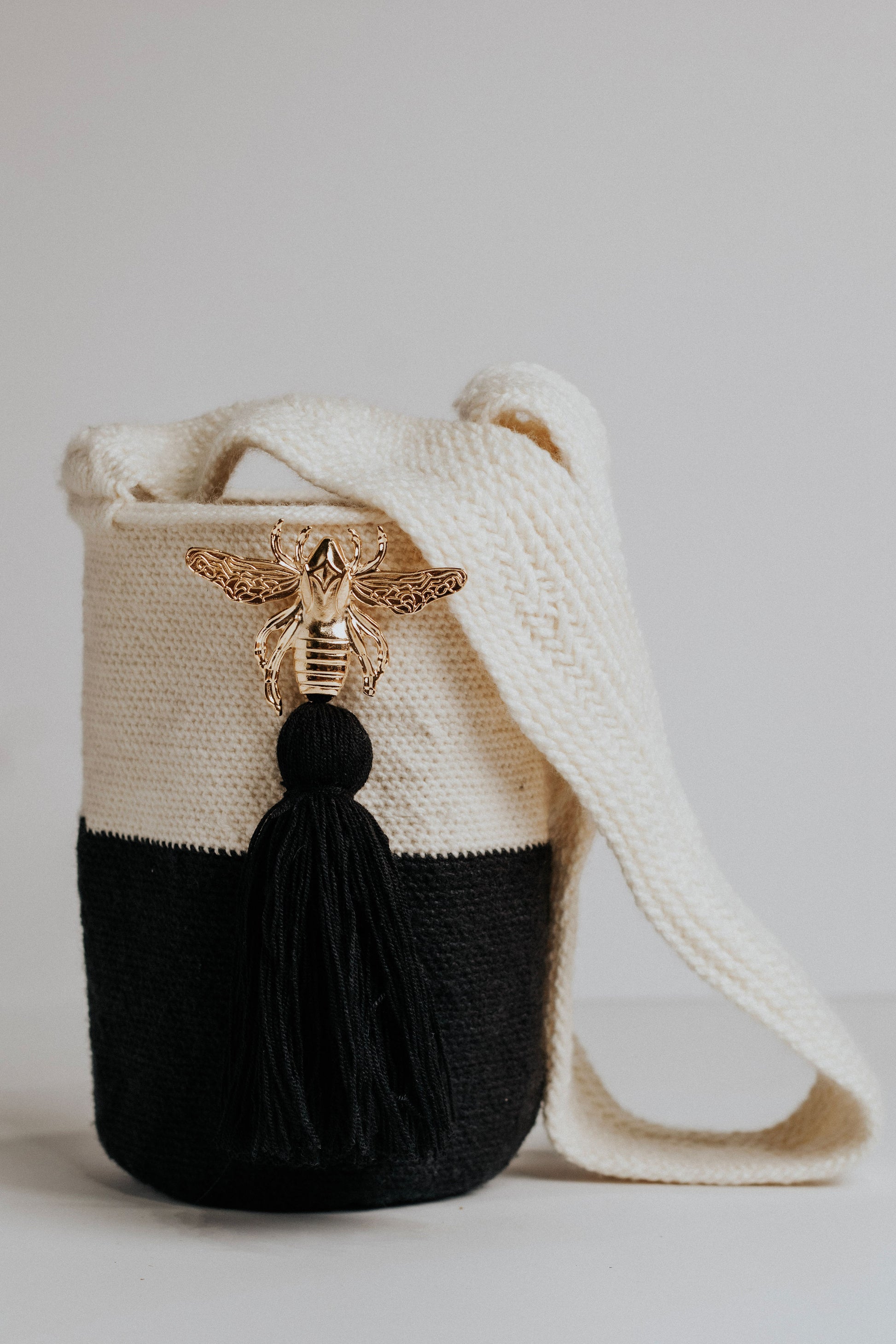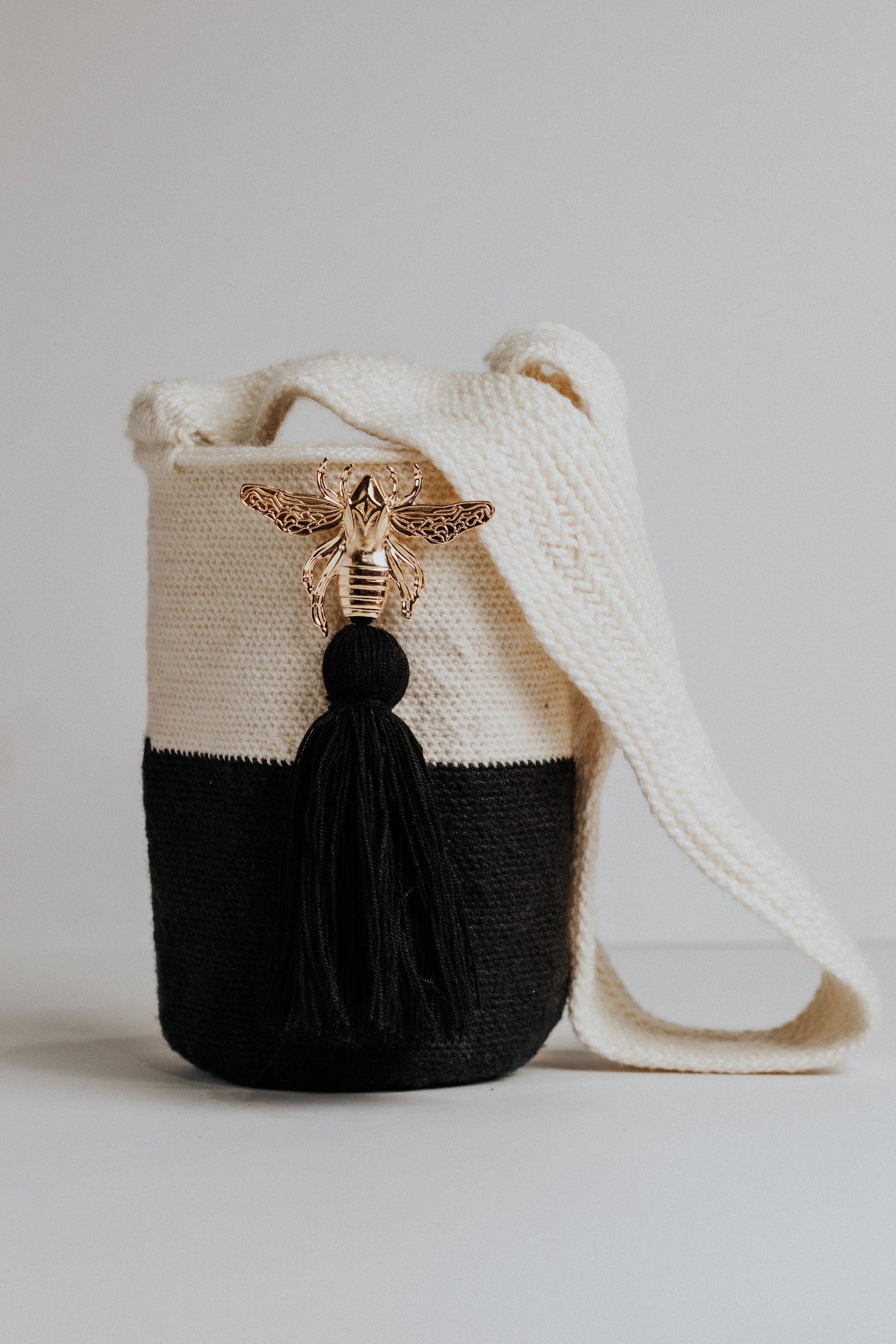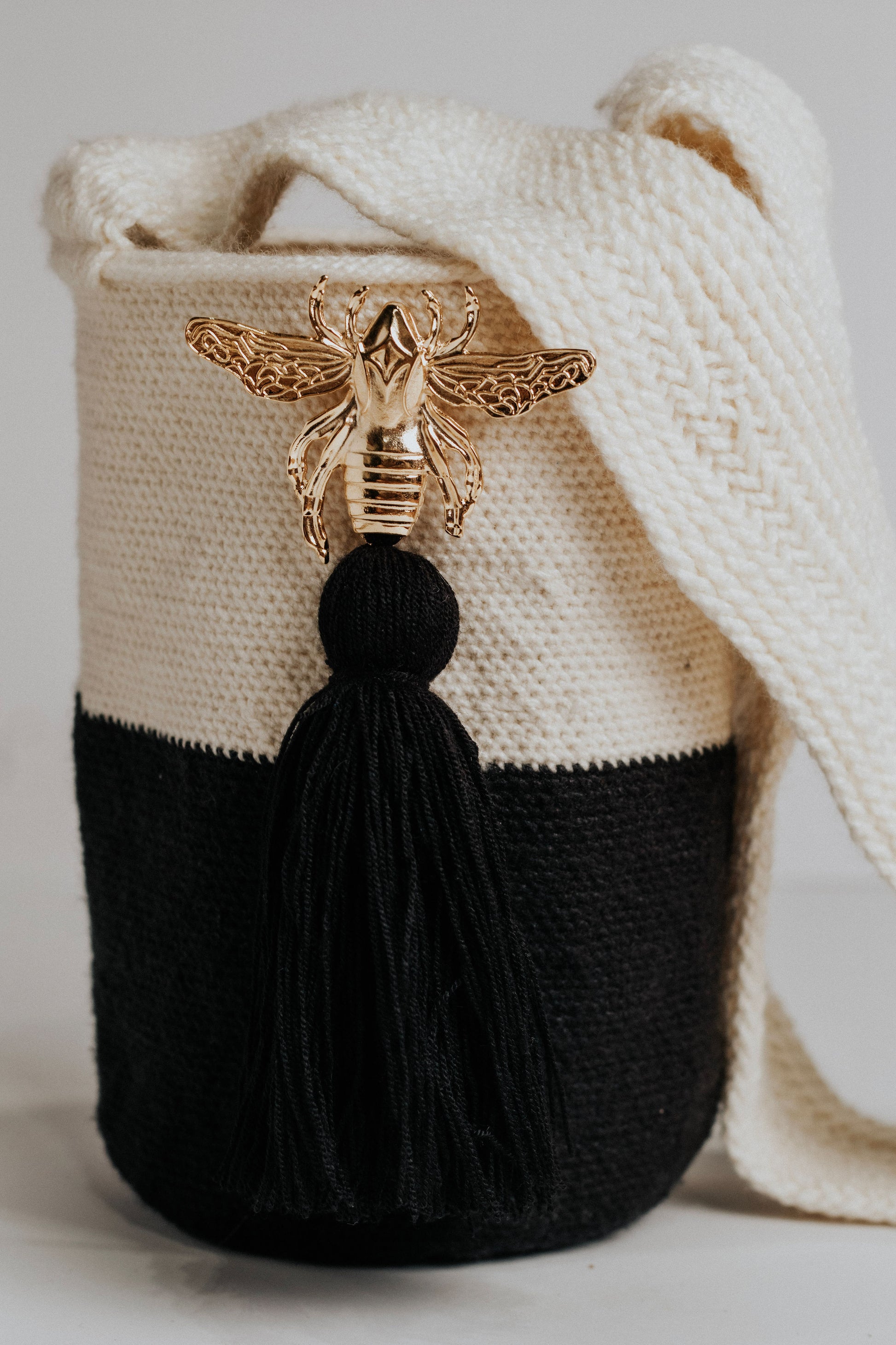 Tejida a mano en Pueblo Bello, Colombia, KAIRÍ representa el equilibrio. Su impactante composición en negro y marfil se realza con una borla central negra y un emblema de abeja dorada — símbolo de fuerza, unidad y energía sagrada. Minimalista en diseño, pero rica en significado, KAIRÍ es una declaración silenciosa de elegancia e intención.