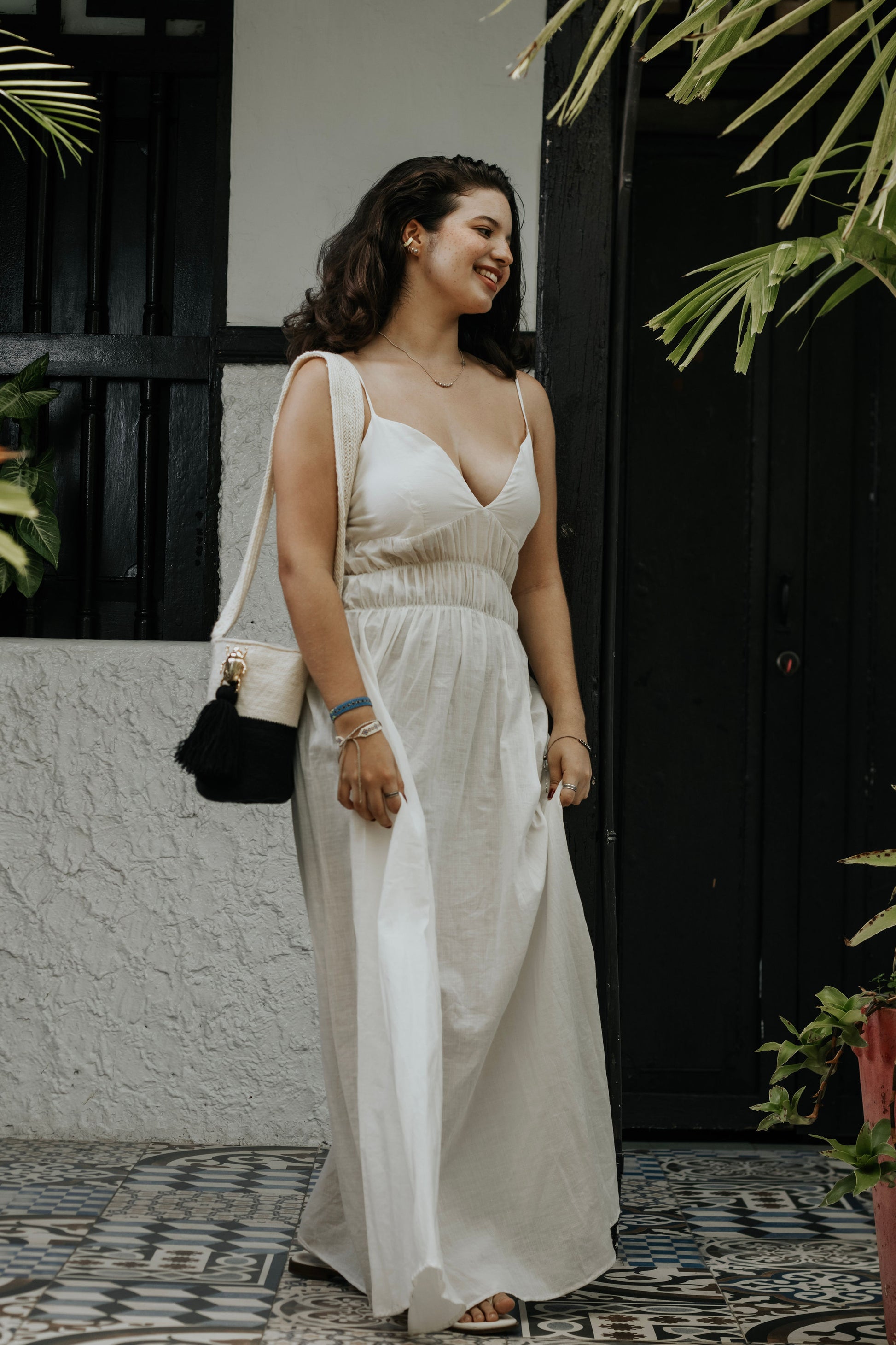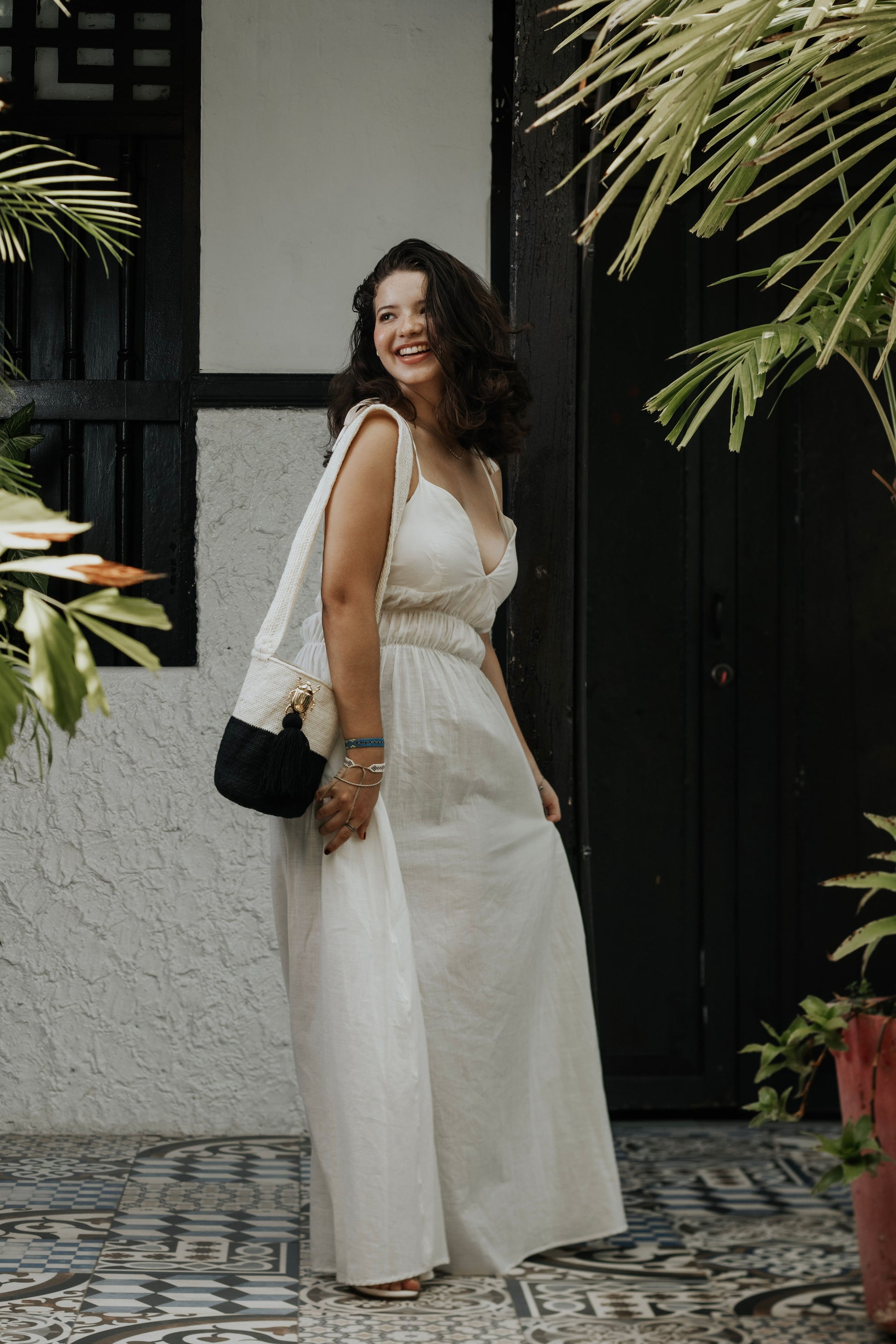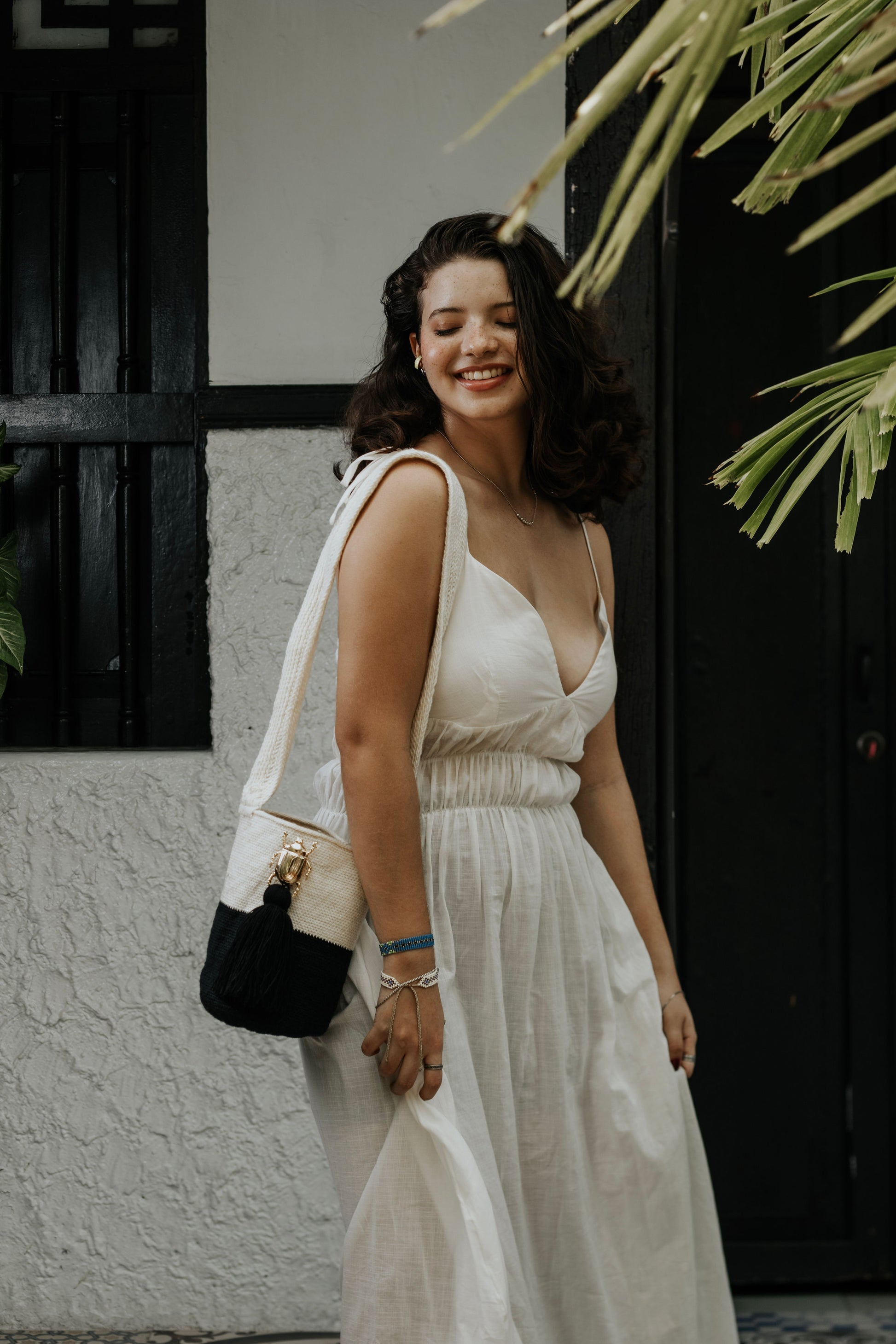 Tejida a mano en Pueblo Bello, Colombia, KAIRÍ representa el equilibrio. Su impactante composición en negro y marfil se realza con una borla central negra y un emblema de abeja dorada — símbolo de fuerza, unidad y energía sagrada. Minimalista en diseño, pero rica en significado, KAIRÍ es una declaración silenciosa de elegancia e intención.
