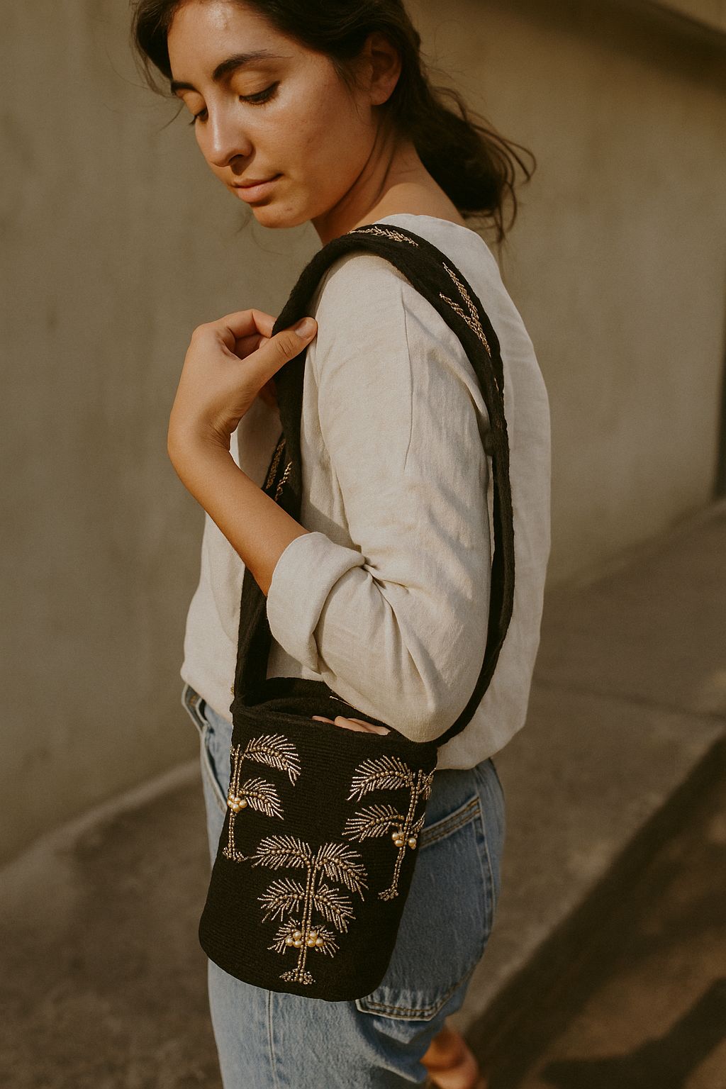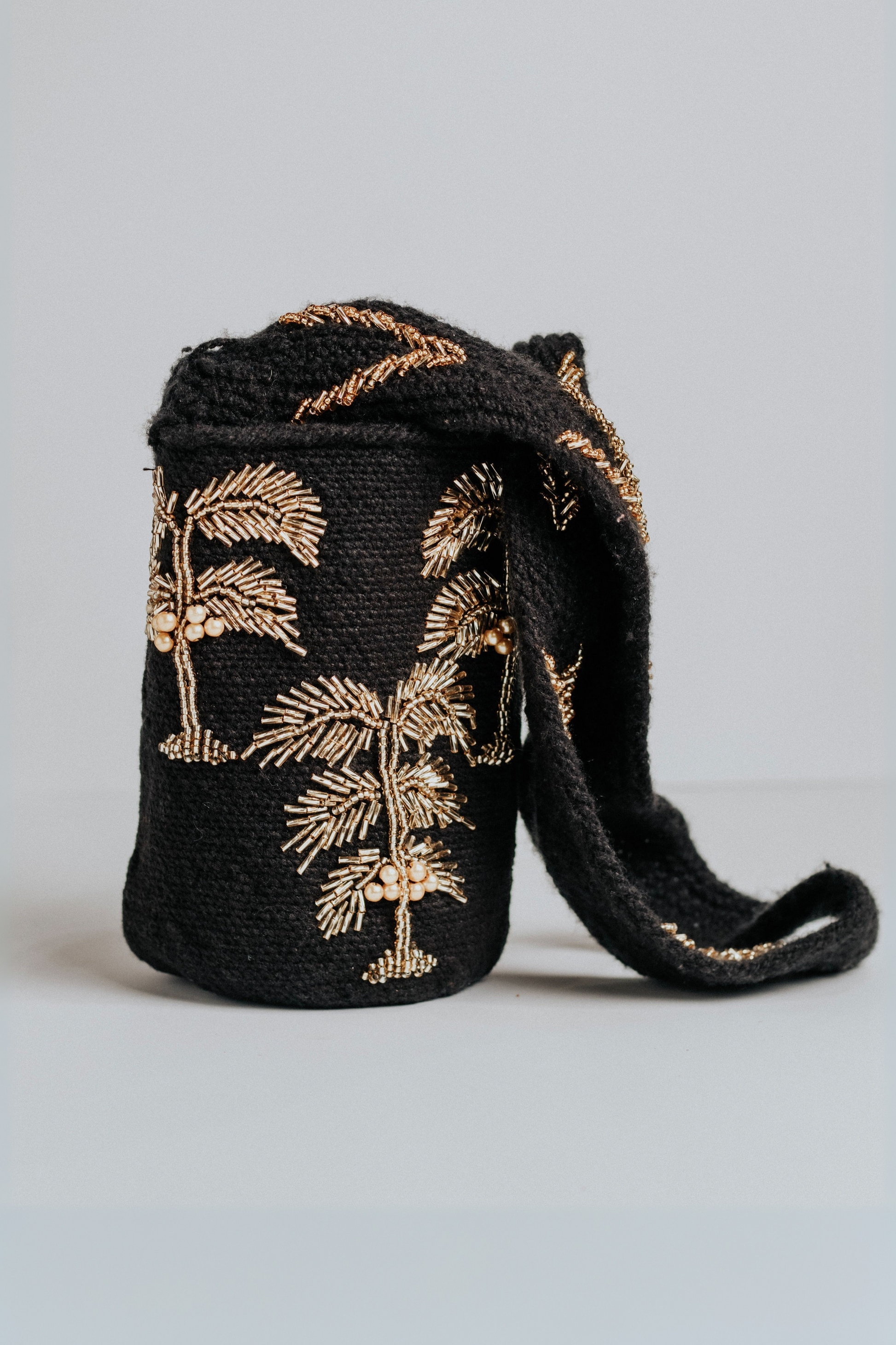 Tejida a mano en Pueblo Bello, Colombia, PALMIRA es una declaración de sofisticación. Su base en negro profundo está adornada con palmas doradas, bordadas a mano con chaquiras checas brillantes y detalles nacarados. El strap continúa el mismo motivo, convirtiendo esta pieza en una fusión perfecta entre encanto tropical y atractivo atemporal.